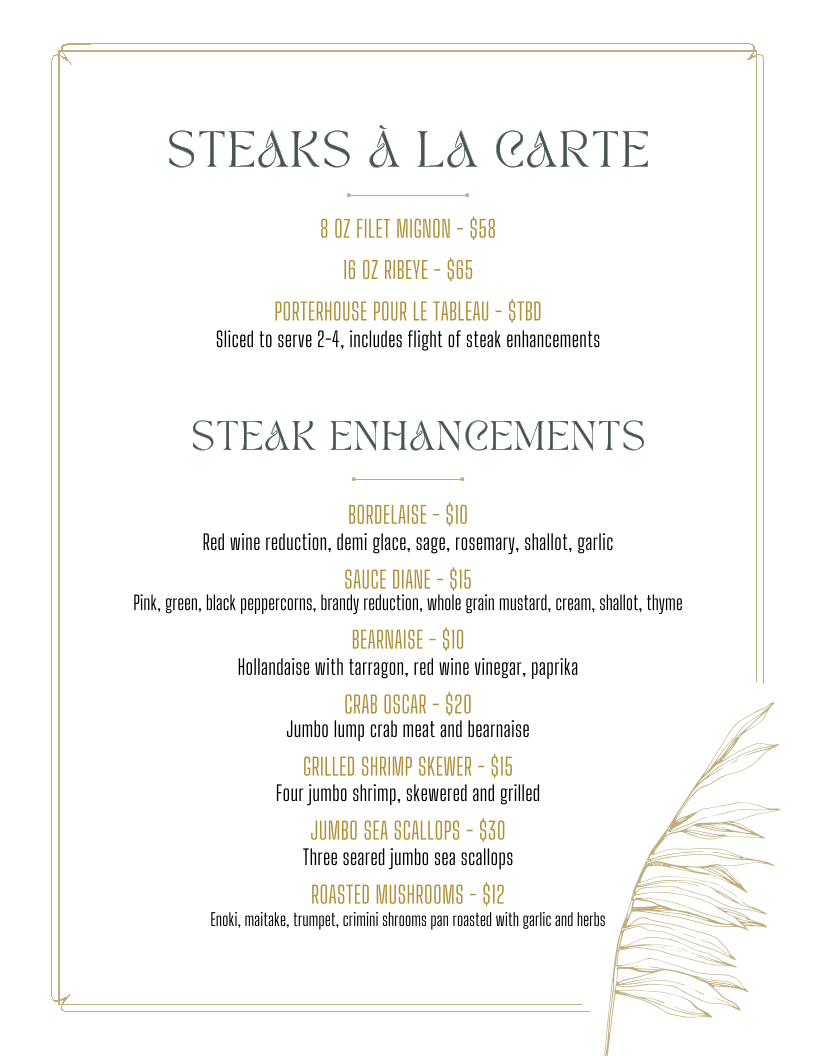 Meat lovers will revel in the perfectly cooked ribeye and unique oyster sampler featuring bacon jalapeno jam.